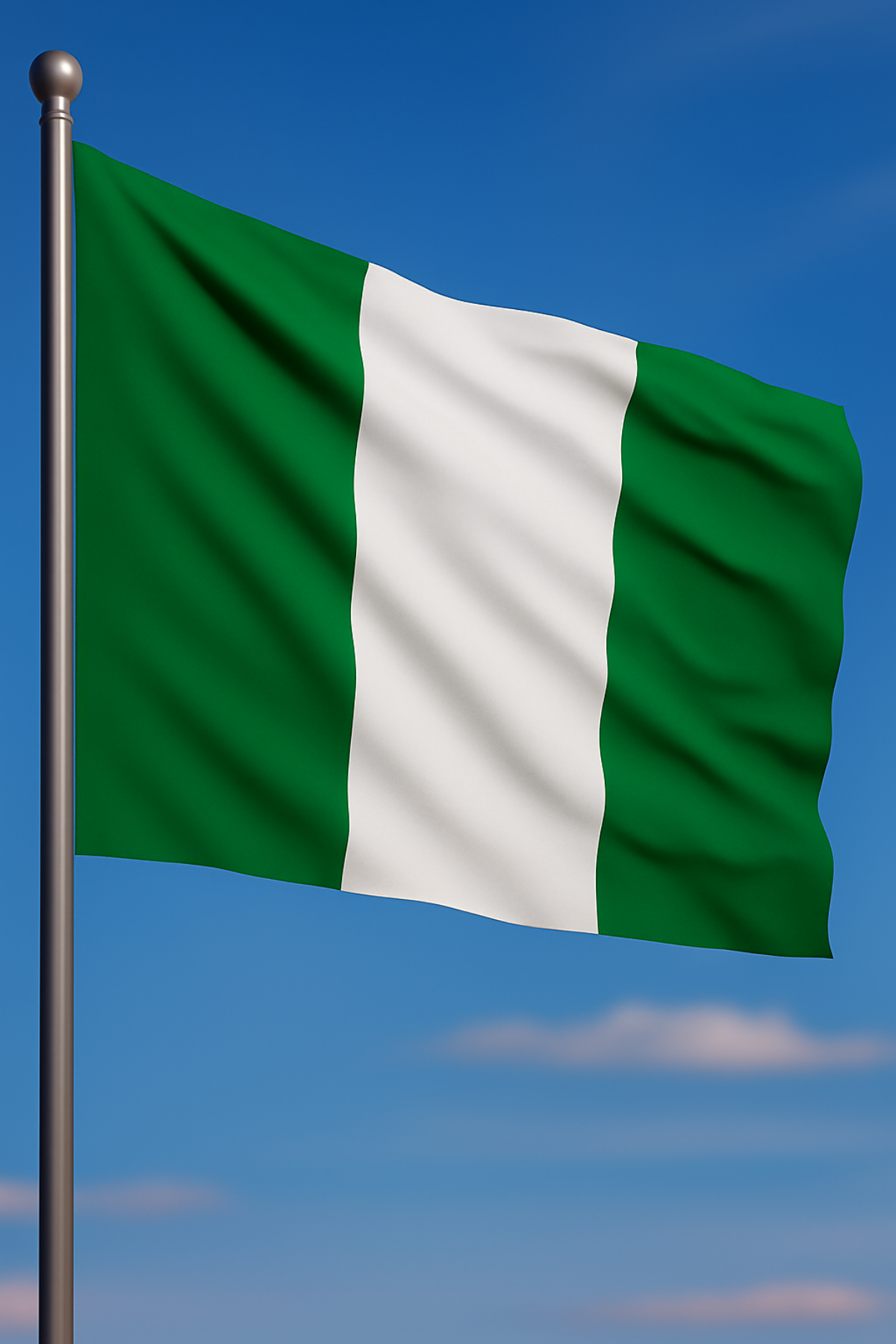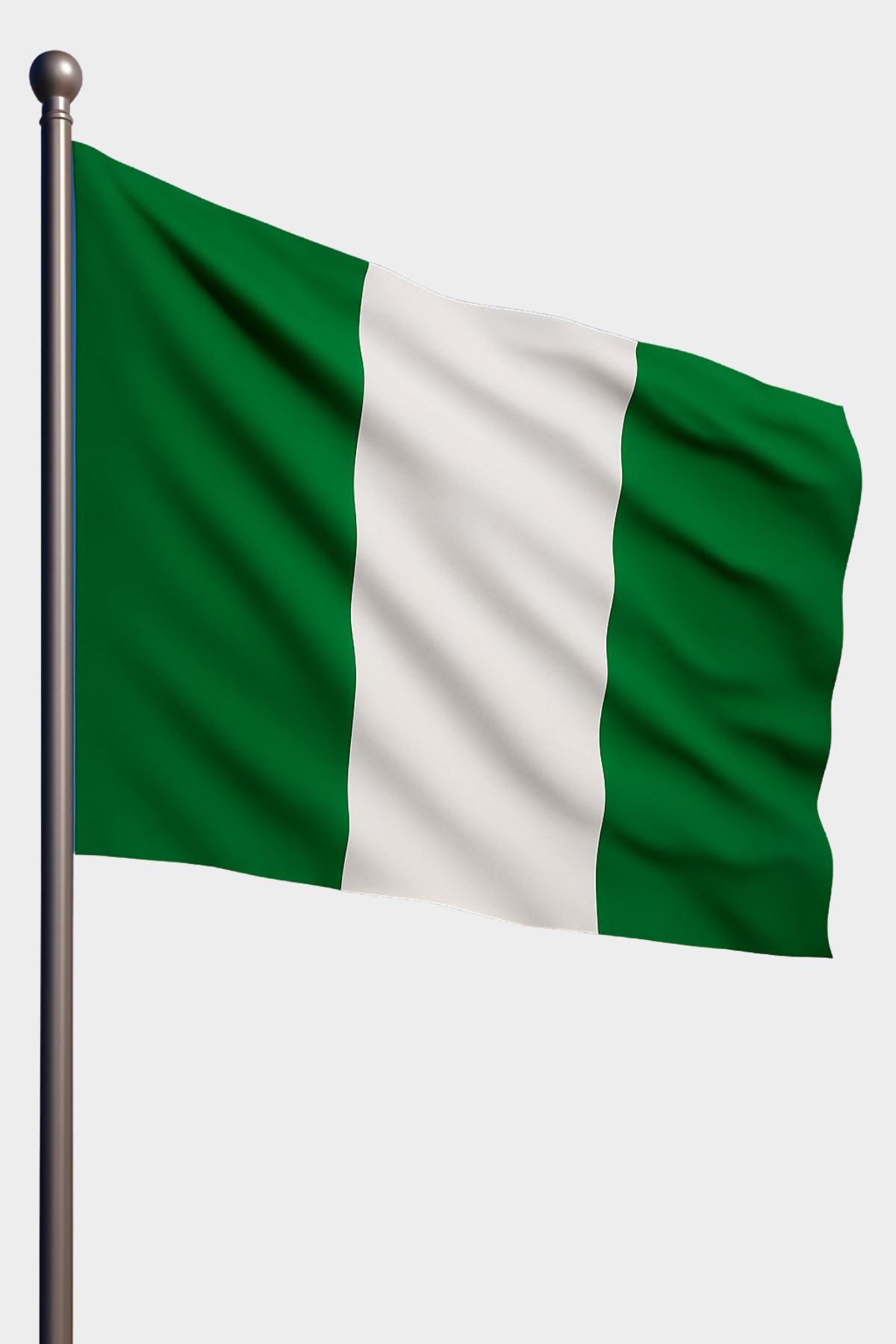 Yeşil-beyaz-yeşil dikey şeritlerden oluşan sade ve zarif tasarımıyla Nijerya bayrağı, ülkenin doğal zenginliğini ve barışa olan bağlılığını simgeler. Dış mekân koşullarına karşı üstün dayanıklılığı sayesinde uzun yıllar boyunca canlılığını korur.