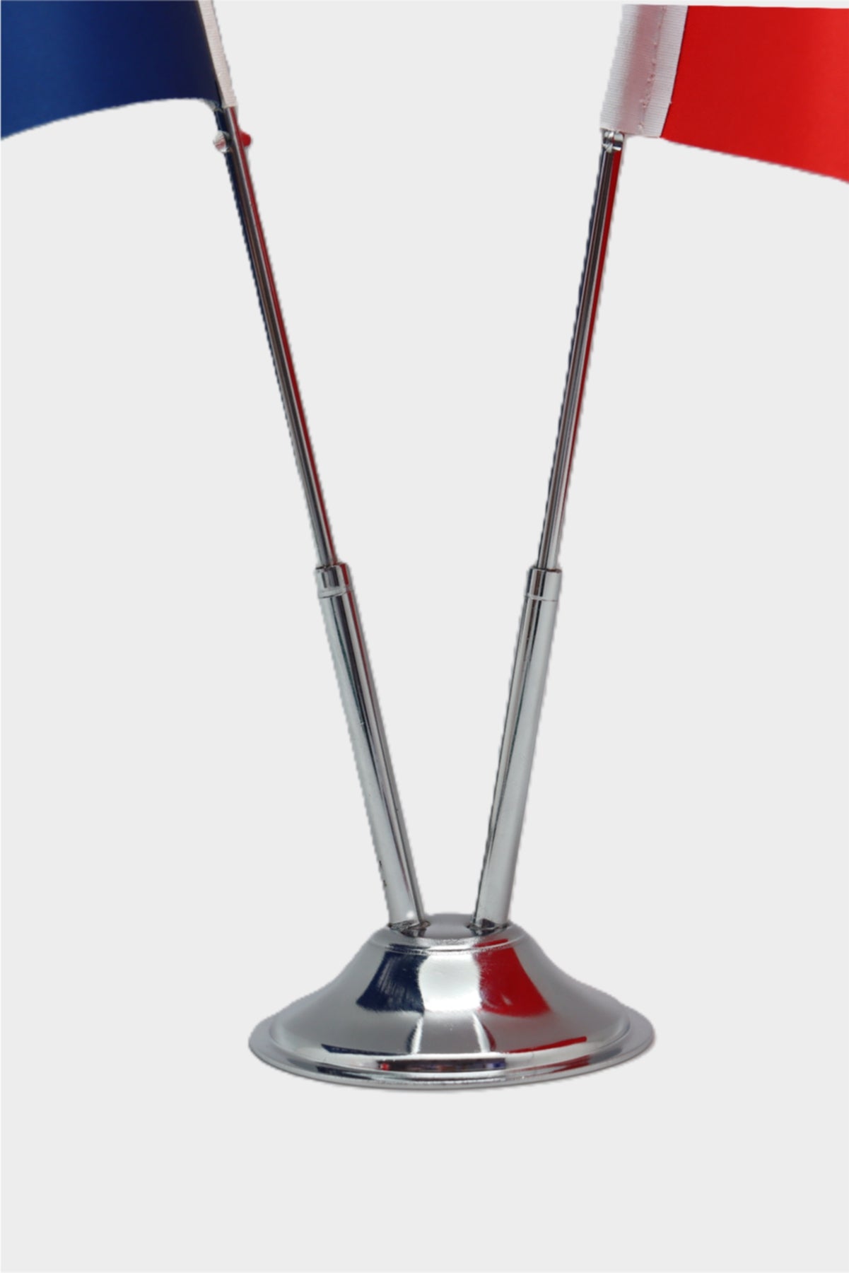Bu ikili masa bayrağı seti, bir yanında Türk bayrağı, diğer yanında ise şirket logonuzu veya özel tasarımınızı sergileyebileceğiniz özelleştirilebilir bir bayrak içerir. Premium saten kumaştan üretilen bu bayraklar, canlı renkleri ve zarif görünümüyle öne çıkar. Yüksek kaliteli süblimasyon baskı sayesinde tasarımınız solmaz, her zaman net ve parlak kalır.