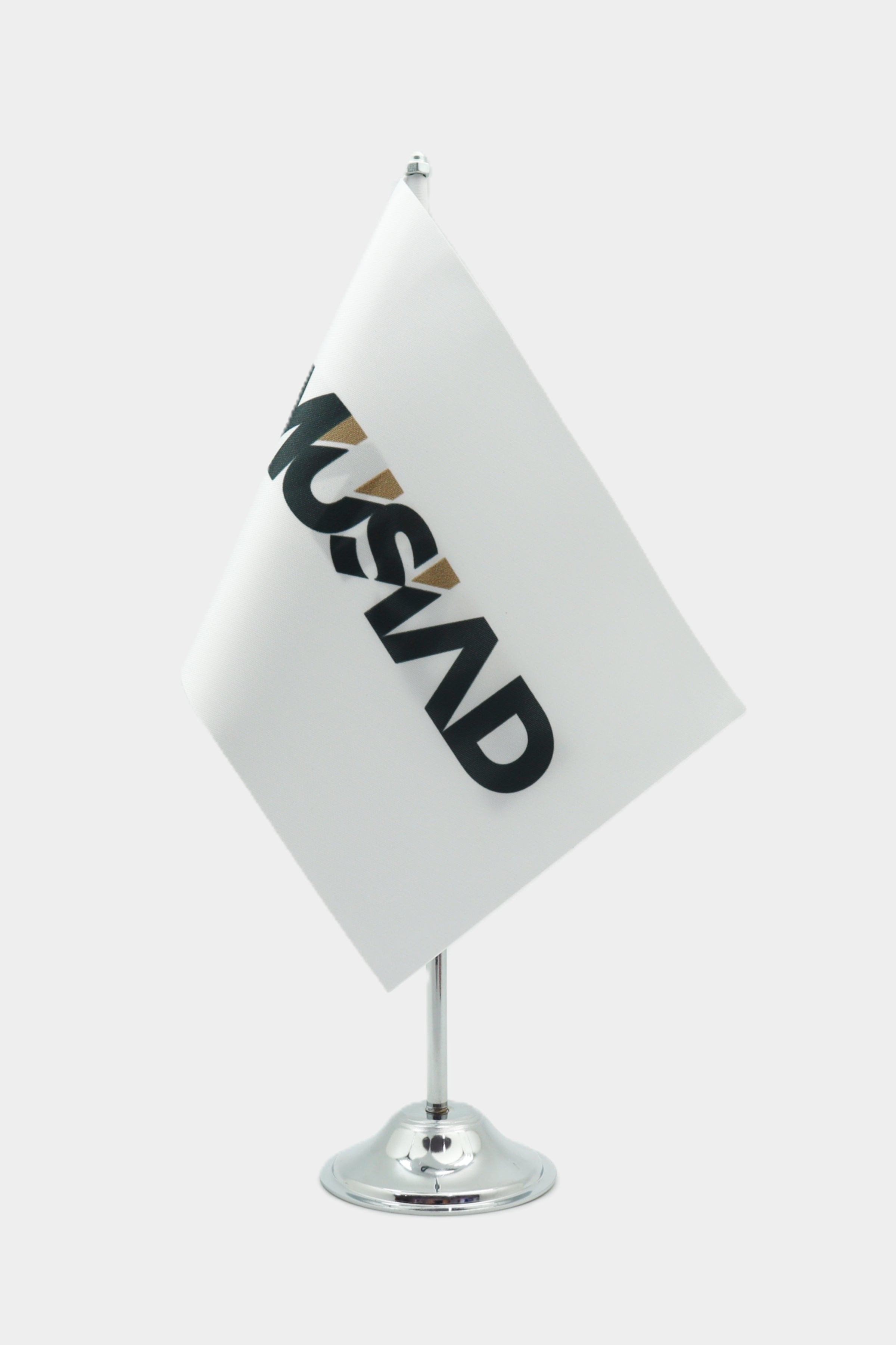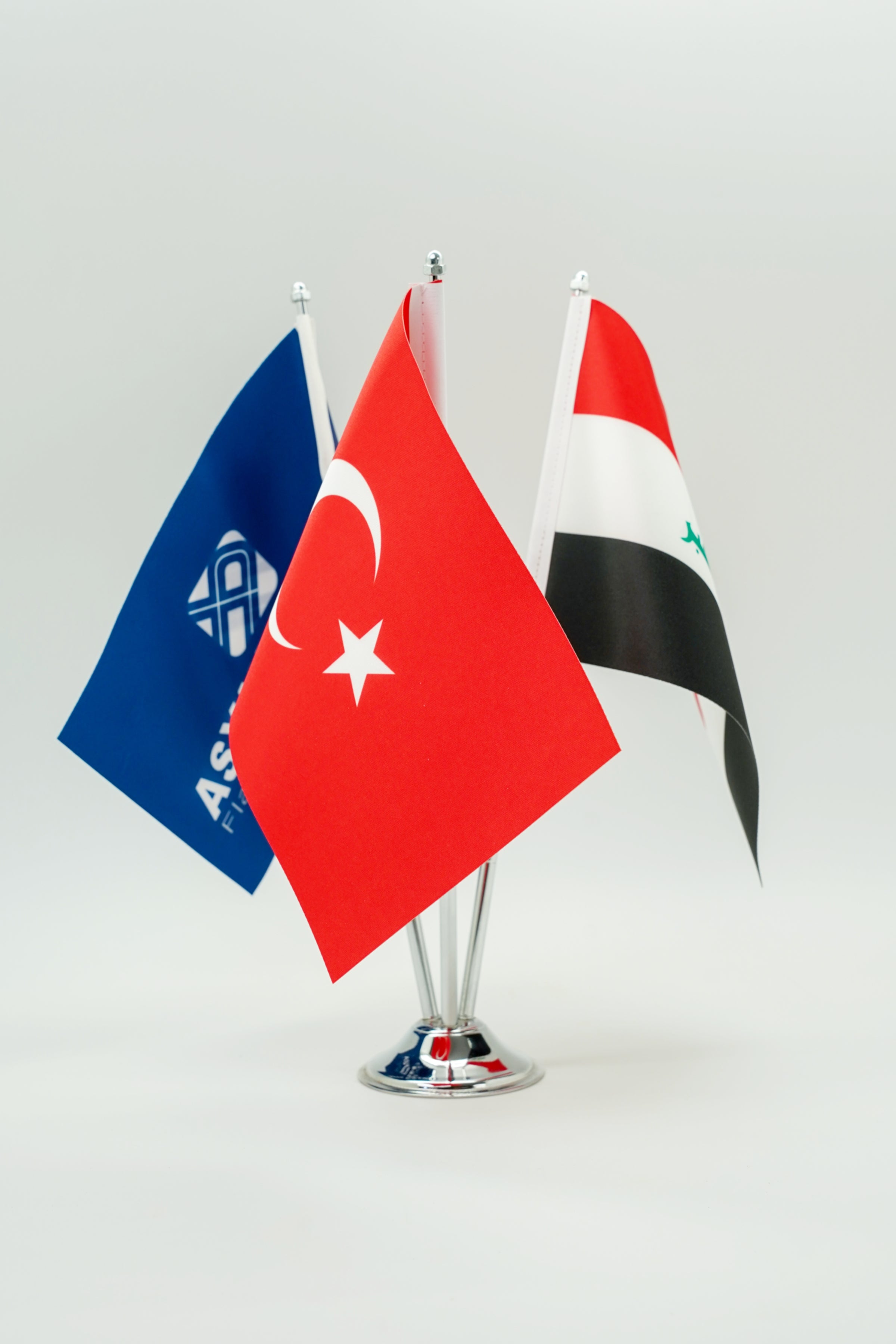 Asya Bayrak Logo Baskılı Masa Bayrakları ile markanızı ön plana çıkarın. Profesyonel ofis teşhirleriniz için özel logo baskısı, parlak saten kumaş ve krom tabanlar.