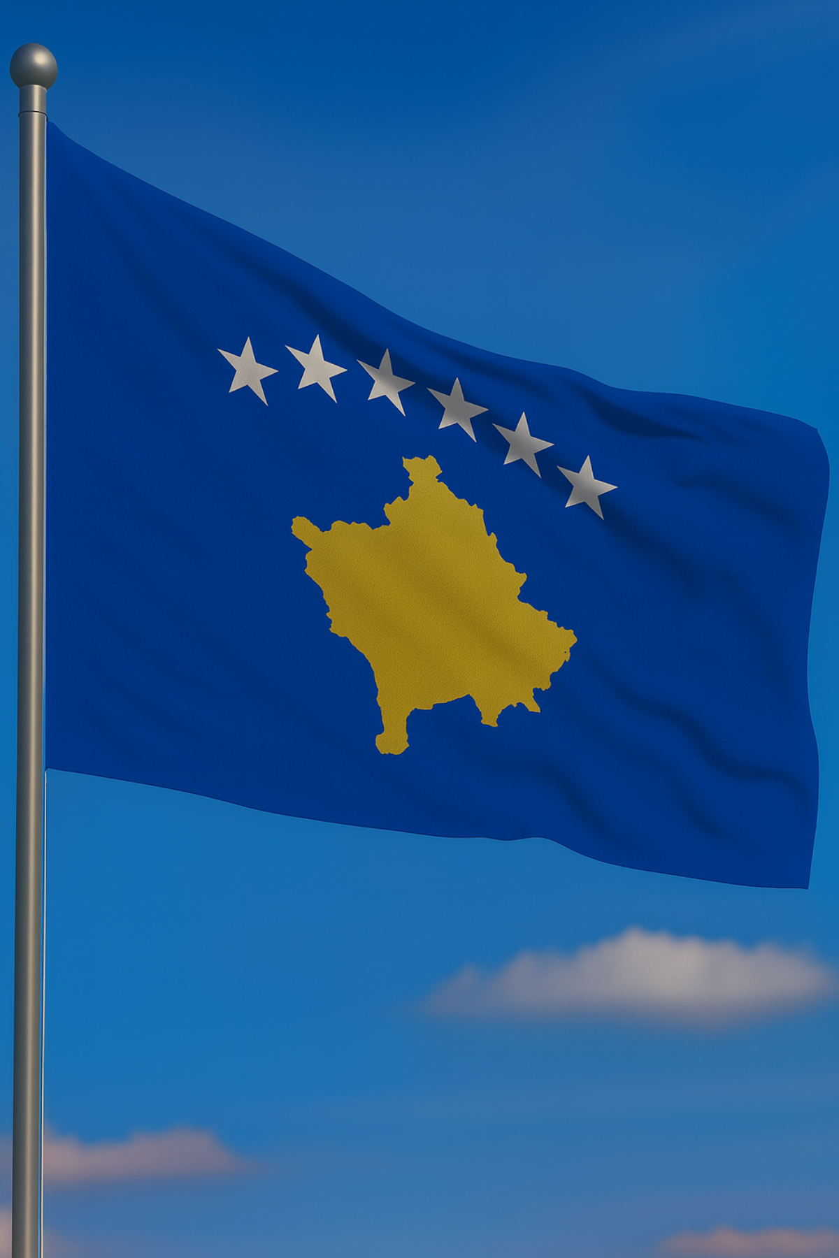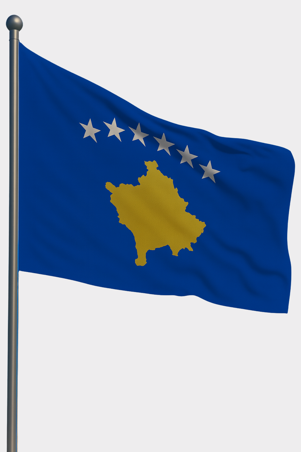 Mavi zemin üzerinde yer alan altın renkli ülke haritası ve üzerindeki altı beyaz yıldız, Kosova’nın çok kültürlü yapısını ve bağımsızlığını simgeler. Dış mekân koşullarına karşı üstün dayanıklılığı sayesinde uzun süreli kullanım için idealdir.